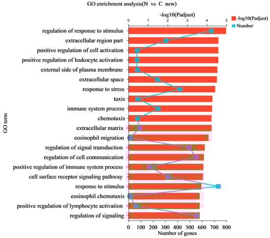 Up-regulated and down-regulated genes were obtained using Genetic Ontology enrichment analysis (p < 0.05). The x-axis at the bottom indicates the number of genes corresponding to the points on the broken line. The x-axis at the top indicates the significance of enrichment corresponding to the bar’s height.