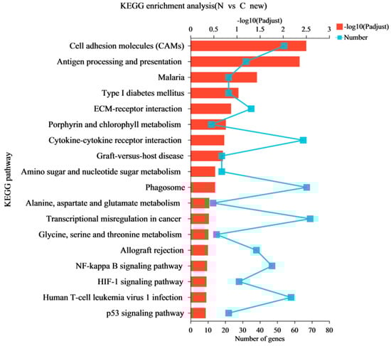 Up-regulated and down-regulated genes were obtained using KEGG enrichment analysis. The x-axis at the bottom indicates the number of genes corresponding to points on the broken line. The x-axis at the top indicates the significance of enrichment corresponding to the bar’s height.