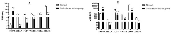 In order to verify the reproducibility and accuracy of the gene expression data obtained by RNA-Seq, we randomly selected six genes for qRT-PCR validation. The qRT-PCR results showed that FABP4 was up-regulated in group C (p < 0.01); APELA, FGF7, WNT5A, CDK6, and APLNR were down-regulated in group C, compared to group N (p < 0.01) (Figure 7B), which was consistent with the results of the RNA-Seq (Figure 7A).