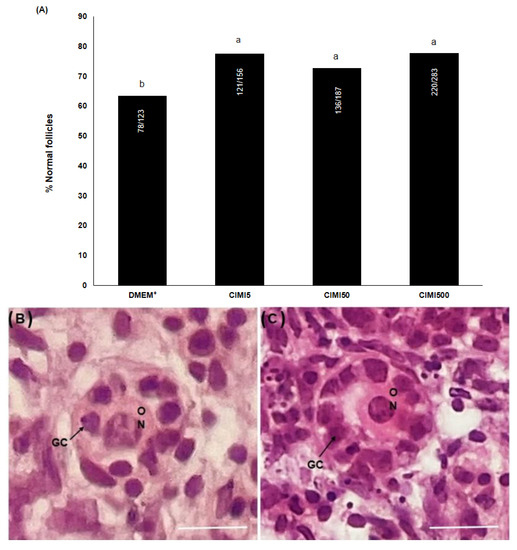 Ovaries cultured in medium supplemented with 5, 50 or 500 ng/mL CIMI had higher (p < 0.05) percentages of morphological normal follicles than those cultured in control medium (DMEM+) (p > 0.05) (Figure 1A). The morphology of follicles from ovaries cultured with DMEM+ alone or supplemented with CIMI is shown in Figure 1B,C.