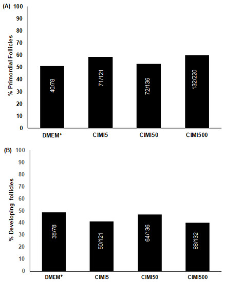 The presence of 5, 50 or 500 ng/mL CIMI did not influence the percentages of primordial and developing follicles (Figure 2A,B) when compared to ovaries cultured with DMEM+ alone (p < 0.05).