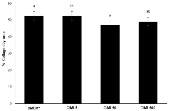 Ovaries cultured in medium containing 50 ng/mL CIMI had reduced percentage of collagen fibers when compared with those cultured with only DMEM+ (Figure 3). Nevertheless, when ovaries were cultured in the presence of 5 or 500 ng/mL CIMI, the tissues maintained their percentage of collagen fibers similar to those cultured in DMEM+ alone (p < 0.05).