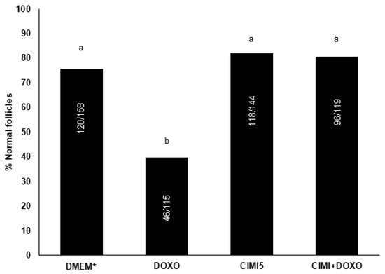 The percentage (mean ± SE) of normal follicles in ovaries cultured in DMEM+ alone or supplemented with DOXO (0.3 μg/mL), CIMI (5 ng/mL) and CIMI+DOXO (5 ng/mL + 0.3 μg/mL). The percentage of normal follicles was evaluated using the chi-square test. a and b different lowercase letters indicate statistically significant differences between treatments (p < 0.05). Numbers of follicles evaluated are shown within each column.
