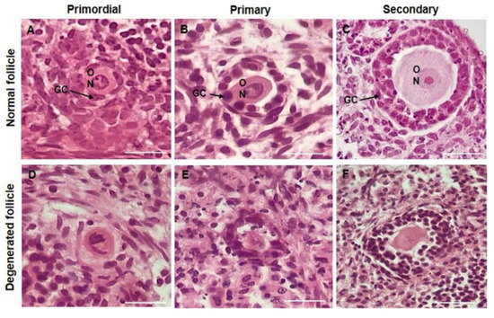 Representative images of ovarian sections of mouse cultured in vitro for 6 days showing a morphologically normal (A–C) and degenerated (D–F) follicles from different stages of development stained with haematoxylin and eosin. (A) Normal and (D) degenerated primordial follicles; (B) Normal and (E) degenerated primary follicles; (C) Normal and (F) degenerated secondary folliclse. Granulosa cells (GC); Oocyte (O); Oocyte nucleus (N). (400×, Scale bar: 100 μm).