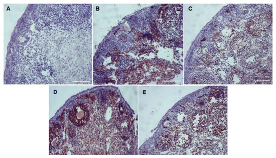 Immunohistochemical staining for caspase-3 in mice ovaries before (A) and after culture in vitro for 6 days in the presence or absence of CIMI or DOXO (B–E): (A) negative control; (B) control group (DMEM+); (C) CIMI (5 ng/mL); (D) DOXO (0.3 μg/mL); (E) and CIMI + DOXO. (100×—Scale bar: 100 µm).