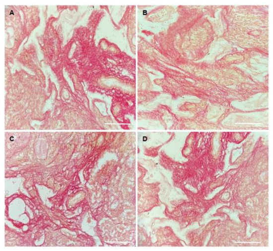 Representative images of collagen fibers labeled by Picrosirius red: (A) control group (DMEM+); (B) DOXO (0.3 μg/mL); (C) CIMI (5 ng/mL) and (D) CIMI (5 ng/mL) + DOXO (0.3 μg/mL). Scale bar: 100 μm (400×).