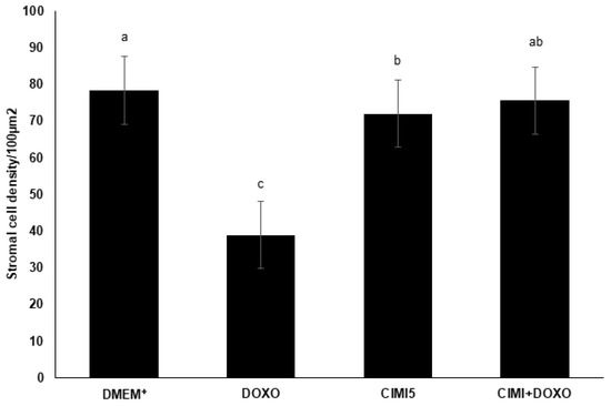 Stromal cell density on ovarian tissues (n = 09 ovaries per treatment) after culturing in DMEM+ alone or with DOXO (0.3 μg/mL), CIMI (5 ng/mL) and both CIMI and DOXO. Stromal density was analyzed using the Kruskal-Wallis test, followed by Dunn’s comparison. a, b, c different lowercase letters indicate statistically significant differences between treatments (p < 0.05).