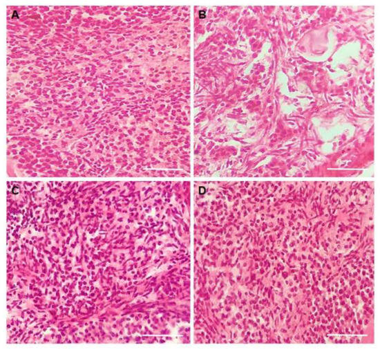 Representative images of ovarian stromal density after 6 days of culture: (A) control group (DMEM+); (B) DOXO (0.3 μg/mL); (C) CIMI (5 ng/mL) and (D) CIMI (5 ng/mL) + DOXO (0.3 μg/mL). Scale bar: 100 μm (400×).
