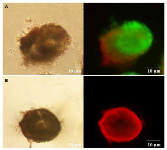 The valuation of follicular viability after staining with calcein-AM (green- viable follicle) and ethidium homodimer-1 (red-non-viable follicle). (A) follicle cultured with both CIMI and DOXO; (B) follicle cultured with DOXO. Scale bars represent 10 μm.