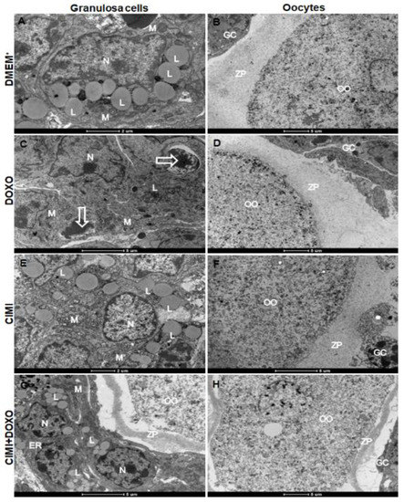Representative micrographs of mice ovaries cultured for 6 days: (A,B) control group (DMEM+); (C,D) DOXO (0.3 μg/mL); (E,F) CIMI (5 ng/mL) and (G,H) CIMI (5 ng/mL) + DOXO (0.3 μg/mL). M, mitochondria; N, nucleus; ZP, zona pellucida, L, lipid; OO, ooplasm; GC, granulosa cells; ER, endoplasmic reticulum.