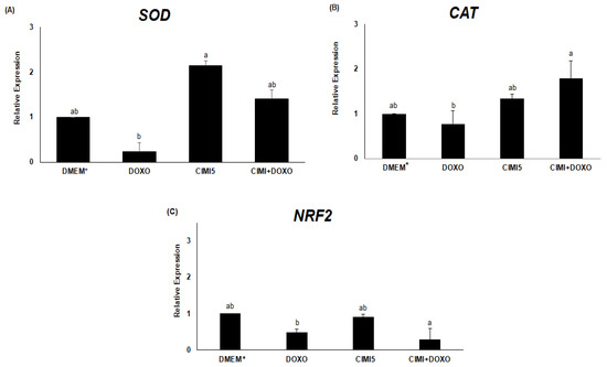 The results showed that ovaries cultured with CIMI alone had increased mRNA levels for SOD than those cultured in presence of DOXO. On the other hand, ovaries cultured with CIMI, DOXO or both CIMI and DOXO had levels of mRNA for SOD similar to those cultured in control medium (Figure 13A). The presence of both CIMI and DOXO significantly increased the levels of mRNA for CAT in cultured ovaries when compared to those cultured in medium containing DOXO (p < 0.05) (Figure 13B). In addition, it is possible to observe that DOXO reduced the mRNA expression for NRF2. On the other hand, ovaries cultured with both CIMI and DOXO showed a lower expression for NRF2 than those culture with only DOXO (p < 0.05) (Figure 13C).