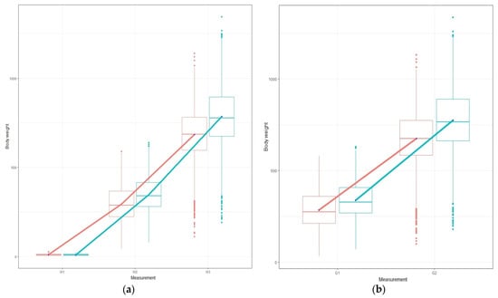 In Figure 1a,b, the body weight and growth for the total population per measurement and per diet is illustrated. In the same figure, the box plots per measurements per diet are also represented. In plots that illustrate the phenotype per diet, the parallel lines illustrate the absence of G × D interaction, whereas the non-parallel lines indicate the presence of it [7]. In our case, the lines from W2 to W3 (1a), as well as for growth (1b), are non-parallel, which indicates the existence of G × E but at a limited scale. Moreover, in Figure 1 all lines indicate diet sensitivity since higher population means appear for the standard commercial diet and lower means appear for the plant diet in all measurements [7]. The lines from W2 to W3, along with growth performance (G1 and G2), show heterogeneity of genetic variance on a limited scale, which is also validated based on the differences in the heritability estimations per diet [7].