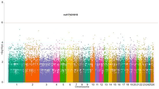 The resulting inflation factor for the GWAS was 1.071. One locus significantly associated with viability (Table 2) was found. The study’s Manhattan plot is presented in Figure 1, and the regional association plot is shown in Supplementary Figure S1. Since viability is not a quantitative trait, the association boxplots were uninformative. For that reason, we could only speculate about the locus’s inheritance model based on the association results for the four models investigated (additive, dominant, recessive, and overdominant). The lowest p-value (Supplementary Table S7) was observed for the additive model, with a p-value of 4.6 × 10−3, and the G-allele estimated effect was 0.051.