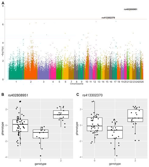 For the two loci associated with the compactness traits, a good fit to the strong overdominant inheritance model was observed. Their variances were relatively high as well, being 30.4% and 35.2% for rs413302370 and rs40280895, respectively. Interestingly, we found associations only for the compactness index, while three out four other traits demonstrated higher estimated additive heritability (length index, mass, and cumulative index). This may be related to the observed non-additive effects of SNPs associated with the compactness index and the phenomenon of negative heterosis. The overdominant model indicated the classic pattern of a genotype associated with a trait affected by heterosis, i.e., the heterozygotes showed substantially inferior performance compared to the homozygotes (Figure 2B,C). The effective allele frequencies were significantly different between the parental breeds, which also supports the hypothesis that these loci were involved in negative heterosis. Moreover, these results confirm our previous observations of negative heterosis manifestations in relation to the diagonal body length and the chest depth and width, due to the associations demonstrated for the compactness index to comprise the diagonal body length and chest girth.