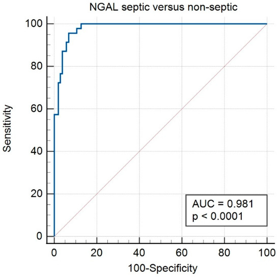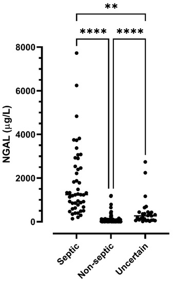 To analyze the ability of NGAL to discriminate septic from non-septic, but also septic from uncertain and uncertain from non-septic, ROC curves were plotted (Figure 4, Table 2). The best threshold (cut-off) for distinguishing septic from non-septic was 293.6 µg/L, and the best threshold for distinguishing septic from uncertain was 444.6 µg/L (Table 2). Diagnostic strength (AUC) was very good to excellent (Table 2).