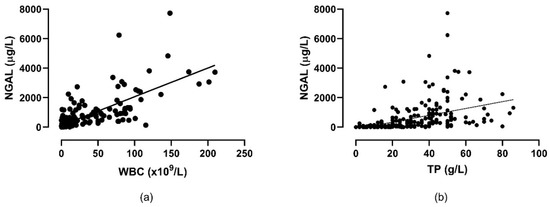 Correlation between concentrations of neutrophil gelatinase-associated lipocalin (NGAL) and (a) total leukocyte count (WBC) and (b) total protein (TP) in synovial fluid samples from 152 horses with and without septic synovitis.