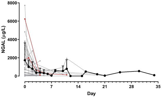 Concentrations of neutrophil gelatinase-associated lipocalin (NGAL) in synovial fluid obtained sequentially over the course of treatment of 35 horses suspected of septic synovitis. Samples were obtained at the attending clinician’s discretion, so with varying intervals, 1–34 days after initiation of treatment. Thin lines represent individual horses (grey = survivors [n = 33]; red = euthanized horses [n = 2]), the bold black line represents average of all horses, error bars are standard deviations.