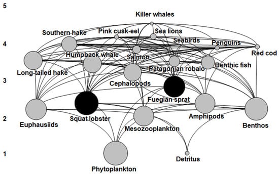 Ecosystem flow diagram of the Francisco Coloane Marine Area. Groups are distributed on the vertical axis according to their trophic level (i.e., 1–5). The circles are proportional to the functional biomass size of the groups. Squat lobster and Fuegian sprat groups are in black.