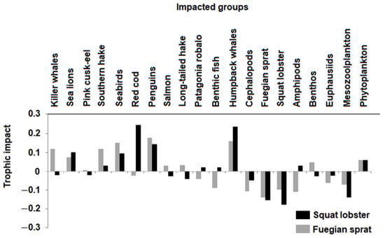 Trophic impacts exerted by the squat lobster (black bar) and the Fuegian sprat (gray bar) on the other functional groups of the Francisco Coloane ecosystem, Magellan Strait.