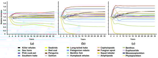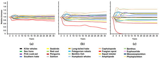 Changes in the relative biomass of the functional groups of the ecosystem in three simulated scenarios for Fuegian sprat showing fishing extraction of 10 (a), 25 (b), and 50% (c) of its biomass.