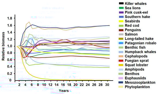 The removal of squat lobster and Fuegian sprat together produced an average increase of 54% in the relative biomass of mesozooplankton and 52% in the biomass of cephalopods (Figure 6). It also caused a decrease in the relative biomass of red cod (54%), humpback whales (48%), penguins (30%), seabirds (19%), sea lions (21%), and southern hake (13%).