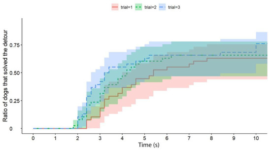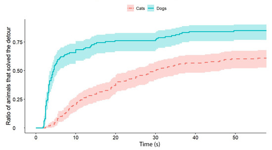 | Latency of detour | The time elapsed from subject release (by the owner) until the subject reached the food. In the case of unsuccessful trials, the maximum value of 60 s is recorded as latency. |