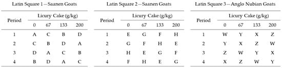 Twelve multiparous lactating goats (eight Saanen and four Anglo Nubian goats; average weight of 46.9 ± 9.4, averaging 105 ± 5 days in milk; and with an average production of 1.5 ± 0.4 kg/day) were used. Animals came from the goat area of the “Entre Ríos” Experimental Farm—UFBA, and were selected considering the uniformity in breed anatomical characteristics, body weight, days in milk, and milk production. Goats were distributed in a triplicate 4 × 4 Latin square design (Figure 1).