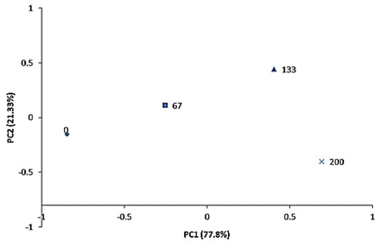 The sensory analysis constituted a set of multivariate data that were arranged in a matrix (412 × 6) and interpreted using principal component analysis (PCA). For this analysis, SAS software version 9.4 (SAS Institute Inc.; Cary, NC, USA) was used with data centered on the mean.