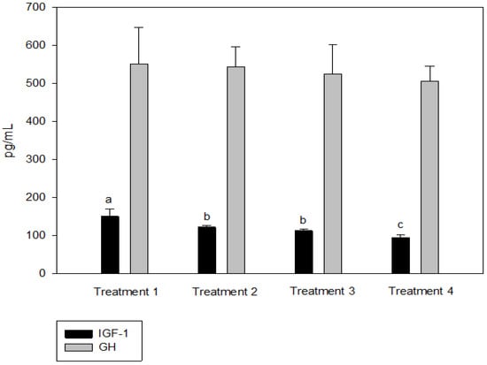 Insulin-like growth factor (IGF-1) and growth hormone (GH) levels of olive flounder Paralichthys olivaceus cultured at four different initial stocking densities. The data are presented as mean ± standard deviation. (Small letters “a, b, c” indicate a significant statistical difference between the treatments.)