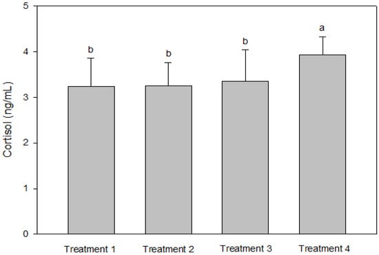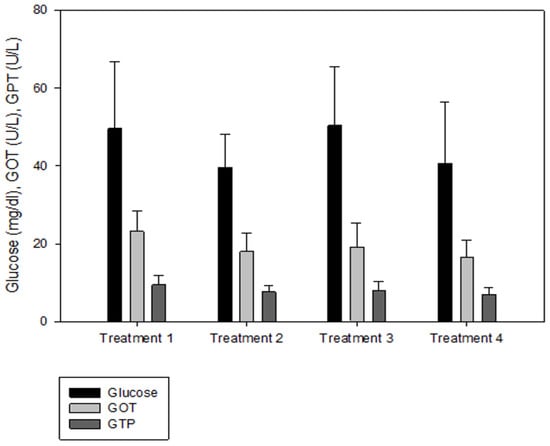 IGF-1 was not significantly different between T2 and T3, but the IGF-1 concentration in the blood decreased significantly as the culture density increased (p < 0.05, Figure 2). There was no significant difference in GH between the groups (p > 0.05, Figure 2). Cortisol was significantly higher at the highest stocking density (T4, p < 0.05, Figure 3). There was no significant difference between the experimental groups for glucose, GOT, and GPT (p > 0.05, Figure 4).