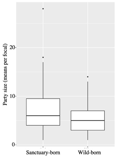 Party sizes for sanctuary-born versus wild-born chimpanzees at the Chimfunshi Wildlife Orphanage Trust, Zambia. Medians are represented by the bold, horizontal lines within the boxes (sanctuary-born = 7.36; wild-born = 6.46). The boxes represent the interquartile range (IQR), the vertical lines attached to the boxes represent Q1 − 1.5 IQR (lower) and Q3 + 1.5 IQR (upper).