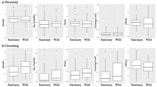 Social network metrics based on (a) proximity and (b) grooming observations for sanctuary-born versus wild-born chimpanzees. None of the social metrics indicate a significant difference in sociality between chimpanzees with qualitatively dissimilar backgrounds.