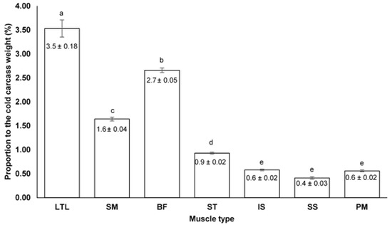 The mean proportion (%) of each individual muscle to the mean cold carcass weight of the 20 Plains zebra stallions were pooled and presented in Figure 1. Significant differences were found between the hindquarter muscles; the LTL (3.5%), SM (1.6%), BF (2.7%) and ST (0.9%) which also significantly differed from the smaller sized muscles, the IS (0.6%), SS (0.4%) and PM (0.6%). The differences found between muscles in terms of contribution (and weight) can be attributed to their anatomical location and function. The LTL was found to be the highest contributing muscle which is expected since the LTL is an epaxial muscle with many bundle fibres extending over the vertebral column from the forequarter to the hindquarter [64]. The BF was the second-highest contributing muscle followed by the SM and then the ST. These muscles are the proximal muscles on the pelvic limb and are larger than the muscles on the shoulder joint due to their locomotive and hip extension functions [64,65]. The PM muscle is a small muscle involved in the flexion of the hip and is one of the most tender muscles on a carcass due to its low functional activity resulting in small fibre diameters and less connective tissue. The PM muscle was found to have a similar contribution as the two stabilizing shoulder muscles; the IS and the SS which are respectively involved in the flexion and extension of the shoulder [64].