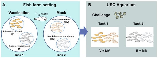 Vaccination and challenge conditions. Fish vaccination was performed in a fish farm (A). After prime vaccination or booster, fish were transported to the USC aquarium facilities for challenge (B).