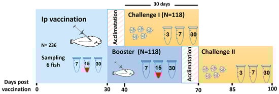 Experimental design. After arrival to the USC aquarium facilities, fish were acclimated for 10 days before challenge. Mock-vaccinated individuals were handled and sampled as vaccinated fish.