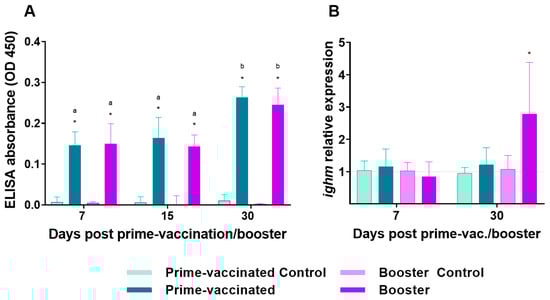 To further analyse the antibody response, transcriptional levels of ighm gene in the head-kidney were assessed at 7 and 30 dpv/dpb. After 30 dpv/dpb a significant increase in the ighm transcriptional levels was recorded in fish from the booster group, which differed significantly from prime-vaccinated individuals (Figure 3B).