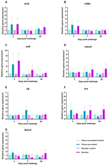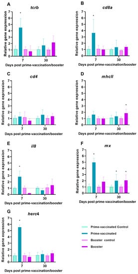 Expression of immune-related genes (A) tcrb, (B) cd8a, (C) cd4, (D) mhcII, (E) il8; (F) mx and (G) herc4, in the head-kidney of Senegalese sole specimens at 3-, 7-, and 30-days post challenge (dpc). Challenge was performed by intramuscular injection with 2 × 103 TCID50/g for prime- and booster-vaccinated fish, respectively. Data represent the mean ± standard deviation (n = 6 fish/group and time). Asterisks represent statistical differences between control and prime-vaccinated/booster groups (p < 0.05).