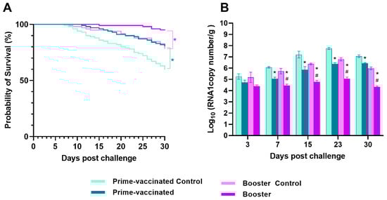 Protection conferred by the vaccination/re-immunization and decrease of the viral load in sole brains. (A) percent of survival during 30 days of in vivo infection and (B) viral load (n =3 fish/group and time) in brain from challenged Senegalese sole specimens. (A) Survival rates were compared between groups using the Kaplan Meier test. Asterisks denote differences between survival curves according to a log-rank Mantel Cox test (p < 0.001), (B) Infection was performed by intramuscular injection with 2 × 104 TCID50/g. Asterisks represent statistical differences between control and prime-vaccinated/booster groups whereas hash symbols represent significant differences between prime- and booster-vaccinated groups at a same time point (p < 0.05).