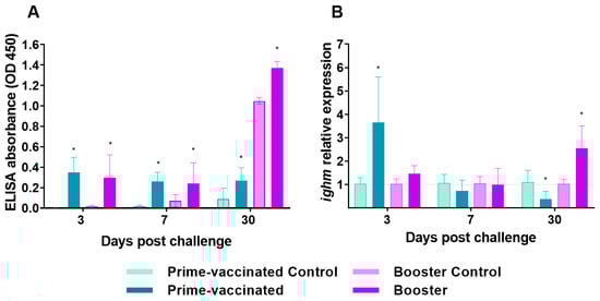 IgM levels in the serum (A) and transcription of igm (B) in the head-kidney of vaccinated and re-immunized fish at 3-, 7-, and 30-days post challenge (dpc). Challenge was performed by intramuscular injection with 2 × 103 TCID50/g for prime- and booster-vaccinated fish, respectively. Data represent the mean ± standard deviation (n = 6 fish/group and time). Asterisks represent statistical differences between control and prime-vaccinated/booster groups (p < 0.05).