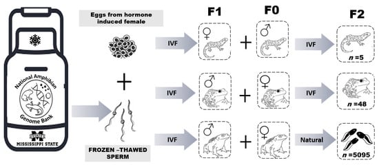 One of the most promising technologies for managing threatened amphibian populations with declining heterozygosity is cryopreservation of sperm. The sperm cells held in cryo-storage can remain frozen for multiple years and can subsequently be thawed for use in generating future populations, as well as recovering lost genetic lineages. During freezing, sperm cells experience osmotic stress, ice nucleation, solution effects and cryoprotectant toxicity, which are all physical stressors that result in cell degradation and death []. Cells that survive the freeze–thaw cycle may exhibit molecular damage including disruption of disulfide bonds, DNA strand breaks, alteration of mRNA expression, changes in methylation patterns, and other epigenetic markers [,]. However, there are a number of antioxidants, membrane stabilizers, ice recrystallization inhibitors, antifreeze proteins and other compounds known to minimize ice nucleation and prevent physical and molecular stressors during cryopreservation, thereby mitigating deleterious effects of offspring from cryobanked sperm [,,]. Examples of these mitigating compounds are permeating and non-permeating cryoprotectants, which have been shown to increase membrane fluidity and reduce water retention within the cell, minimizing ice crystal formation and its subsequent damage []. While various cryoprotectants, cooling rates, and thawing times are being investigated on post-thaw sperm survival [], determining the reproductive potential of individuals produced using frozen sperm is critical as a proof of concept towards multigenerational sustainability. Further inclusion of ART into conservation breeding programs will depend on whether cryo-produced animals contain epigenetic defects that may reduce growth or reproductive potential in future generations.