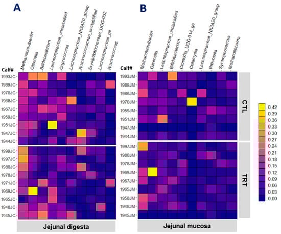 The relative abundance of the 10 most abundant genera in jejunal digesta (A) and jejunal mucosa (B) of weaned calves (95 d old) in control (CTL) and MCE-fed (TRT) groups.