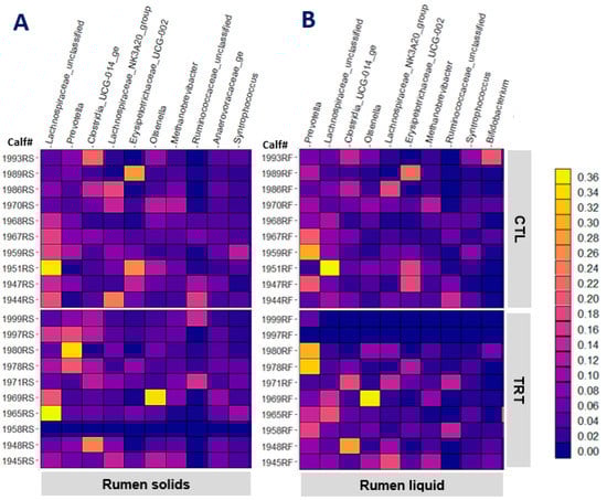 The relative abundance of the 10 most abundant genera in rumen solids (A) and rumen liquid (B) of weaned calves (95 d old) in control (CTL) and MCE-fed (TRT) groups.