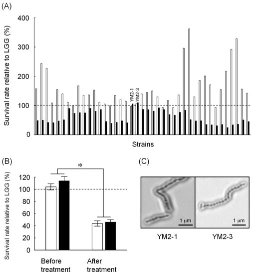 A total of 101 strains were obtained from enrichment cultures of raw milk from five healthy female Japanese-Saanen goats. All strains were identified as Gram-positive bacteria and harbored catalase-negative and no gas-producing characteristics (Table 1). Microscopic observations revealed five different bacterial morphologies, indicating 5 monococci, 31 diplococci, 24 tetracocci, and 41 streptococci or bacilli. Of these, 41 strains showed similar or higher tolerance to either low pH or bile salts compared to LGG (Figure 1A). Several strains isolated in this study showed apparently higher tolerance to low pH than LGG, but most of them were less tolerant to bile salts than LGG. Only two strains showed tolerance to both low pH and bile salts that are comparable to LGG. These two strains, named as YM2-1 and YM2-3 (see Figure 1A), were isolated under anaerobic MRS culture conditions at 42 °C. These two strains were further examined for their tolerance to successive treatments with low pH and bile salts. Both strains showed tolerance to low pH and bile salts approximately 60% lower than that of LGG (Figure 1B). Light microscopic images of YM2-1 and Y2-3 are shown in Figure 1C. BLAST similarity search revealed that both YM2-1 and YM2-3 were closely related to L. rhamnosus LC3 (query coverage 98%, sequence identity 99%) and L. rhamnosus 330 (query coverage 97%, sequence identity 99%), respectively. Finally, L. rhamnosus YM2-1 and YM2-3 were selected as probiotic LAB candidates for further investigation.