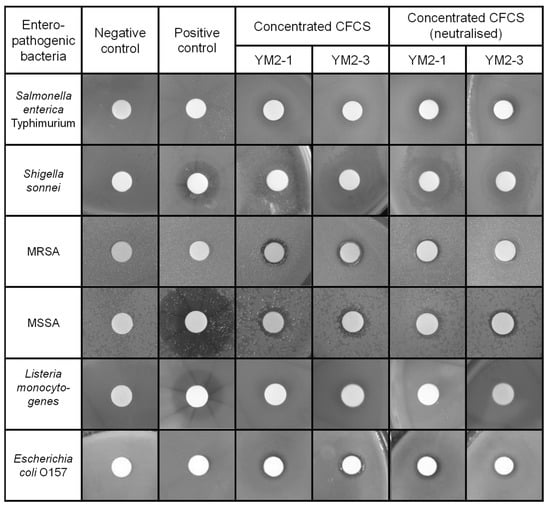 Consequently, concentrated CFCSs of both strains showed antipathogenic activities to a similar extent against tested pathogenic bacteria, except for S. enterica Typimurium (Figure 2 and Table 2). The concentrated CFCS of strain YM2-3 showed significantly higher antipathogenic activity than that of YM2-1, regardless of neutralization treatment. The neutralization of concentrated CFCSs significantly decreased and abolished antipathogenic activity against S. sonnei and L. monocytogenes, respectively. S. enterica Typimurium, MRSA, and E. coli O157 showed resistance against 0.1 mg/mL ampicillin. Two different types of inhibition zones were identified by visual observation of the BHI agar plates. One is low transparency with relatively large diameters, which were observed for S. enterica Typhimurium, S. sonnei, and L. monocytogenes, and the other is high transparency with small diameters, observed for MRSA, MSSA, and E. coli O157. With the exception of L. monocytogenes, antipathogenic activities in concentrated CFCSs of both strains remained after neutralization by addition of 1 M NaOH (Figure 2).