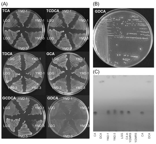 Bioconversion of bile acids and certain enzymes secreted by the intestinal microbiota have been suggested to cause carcinogenicity and inflammation in the intestinal rumen of host animals [66,67]. In this regard, the ability of L. rhamnosus YM2-1 and YM2-3 to hydrolyze six typical bile acids, TCA, TCDCA, TDCA, GCA, GCDCA, and GDCA; convert a representative primary bile acid (CA) to suspected carcinogenic secondary bile acid (DCA); and clarify the activities of enzymes, including carcinogenesis-related hydrolases, such as α-galactosidase, β-glucuronidase, and N-acetyl-β-glucosaminidase, was examined. Results showed no precipitation around the colonies of L. rhamnosus YM2-1 and YM2-3 on all agar plates containing each of the six bile acids, indicating that both strains have no hydrolytic activity on such typical bile acids (Figure 3A,B). TLC analysis confirmed that no bioconversion from primary bile acid (CA) to secondary bile acid (DCA) was caused by the action of the two strains (Figure 3C). Enzyme activities, especially carcinogenesis-related hydrolases, such as α-galactosidase (E13 in Table 4), β-glucuronidase (E15 in Table 4), and N-acetyl-β-glucosaminidase (E18 in Table 4) of both strains, as well as LGG, were lower than the detection limits of the API ZYME kit.