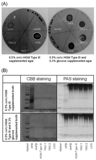 Mucin degradation activities of YM2-1 and YM2-3 strains. (A) 0.5% (w/v) HGM Type III containing agar plates stained with 0.1% (w/v) amido black. Clear zone represents mucin degradation activity of the tested bacteria. (B) Evaluation of mucin degradation activity in vitro on SDS-PAGE gels stained with CBB and PAS reagents. Loss of high-molecular-weight band and presence of smear band in lower-molecular-weight range indicate mucin degradation activity. Marker, precision plus protein dual color standards (Bio-Rad Laboratories, Hercules, CA, USA); HFB, human fecal bacteria (positive control); AHFB, autoclaved human fecal bacteria (negative control); HGM Type III (reference).