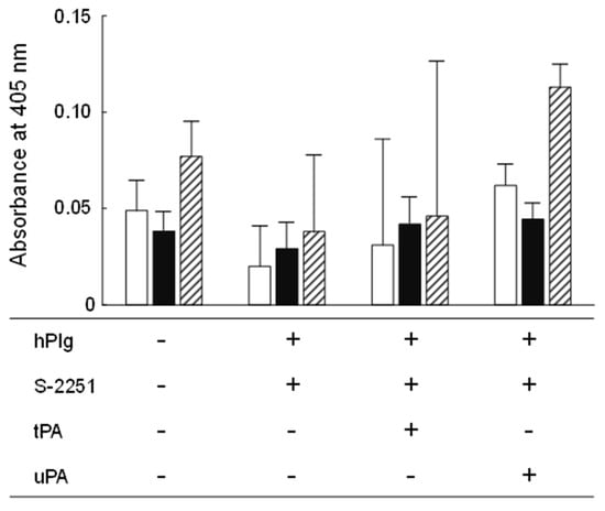 Plasminogen is a proenzyme that not only circulates in the blood stream and plays a significant role in fibrinolysis but is also present in the extracellular matrix (ECM), which is a complex of several glycoproteins, in association with its reconstitution [71]. Plasminogens need to be activated by tPA or uPA to exhibit protease activity similar to plasmin. Pathogenic bacteria are known to bind host-derived plasminogen in the gastrointestinal tract, activate plasminogen, and utilize it as a tool to degrade the host ECM [71]. Therefore, probiotics should ideally not possess plasminogen-activating activity. In the present study, no statistically significant difference was observed in the hydrolysis of the chromogenic plasmin substrate, S-2251, between the negative controls and YM2-1 or YM2-3 (Figure 5). Therefore, it was concluded that both strains were unable to hydrolyze plasminogen in the presence of tPA and uPA into its active form, plasmin.