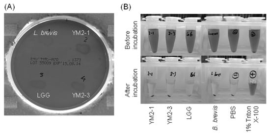 The hemolytic activities of the selected potential probiotic LAB were examined using two different methods [63]. First, the activity was estimated using 5% sheep blood agar plates (Eiken Chemical Co., Ltd., Tokyo, Japan). Briefly, the population of bacterial cells, cultivated for 18 h as described above, was adjusted to 108 colony forming units (CFU)/mL with PBS. A 10 μL aliquot of the bacterial cell suspension was smeared on a 5% sheep blood agar plate, and then incubated at 37 °C for 48 h under anaerobic conditions. Changes in the color surrounding the emerged colonies were visually observed. Levilactobacillus brevis ATCC 8287 was used as the negative control. Second, the activities were examined using a test tube assay. Red blood cells (RBCs) prepared from defibrinated sheep blood (Nippon Biotest Laboratory, Tokyo, Japan) were pelleted via centrifugation at 1500× g for 2 min at 25 °C and then washed three times with PBS. The 108 RBC in 500 μL of PBS were mixed gently with 108 CFU of bacterial cells in 500 μL of PBS. A total of 500 μL of the mixture was incubated at 37 °C for 1.5 h, centrifuged at 1500× g for 10 min at 25 °C, and then the absorbance of the supernatant was measured at a wavelength of 405 nm. Supernatants obtained when RBCs were mixed with 1% (v/v) Triton X-100 (Merck) and PBS were used as the positive and negative controls, respectively.
