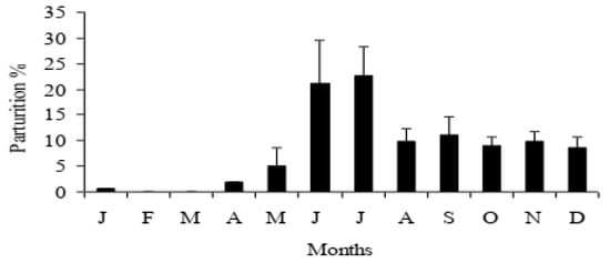 In Nepal, environmental fluctuation is typical, from cold and semi-dry to a dry winter (December–February), rapidly increasing to a hot and dry spring (March–May), with a very hot and rainy monsoon summer (June–August) and moderate autumn (September–November) []. A distinct seasonal breeding pattern is prevalent in Nepalese buffaloes, with the late monsoon, autumn and early winter (i.e., July to December) as the best breeding seasons, and with spring and early summer (i.e., April to June) and January to March as the low and transitional breeding seasons, respectively [,]. As a consequence, the trend of parturition shows the maximum from June to December, with less parturition in January, April and May and almost no parturition in the months of February and March [] (Figure 1). If we combine this problem with the summer infertility of dairy cows, it is apparent that the country suffers a severe drop in milk production during the spring and early summer months.