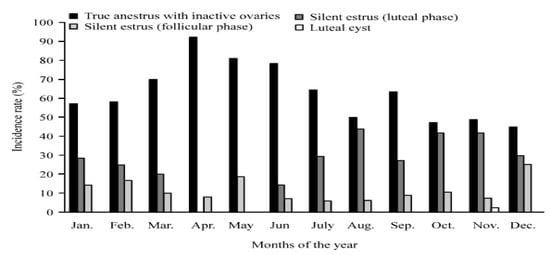 While analyzing the year-round reproductive data of 226 anestrous buffaloes to examine the seasonal variations in the anestrus condition, it was found that the incidence of true anestrus with ovarian acyclicity was >70% during March to June, it peaked (>80%) in April/May and remained at around 50% in August and October-December. Moreover, a considerable proportion of anestrous buffaloes showed silent cyclicity throughout the year [] (Figure 2). The incidence of anestrus in buffaloes is common during the summer months in India, as well as in other parts of the world [,]. Buffaloes suffer from the cessation of ovarian activity and silent heat during the months of dry spring and early summer. Most of the buffaloes exposed to extreme hot conditions cease ovarian activity [,].